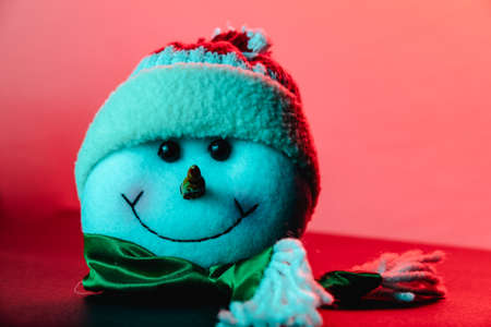 Christmas mood concept. Flatlay composition with red hat and scarf, toy bear, coca cola and traditional festive decorations. Flatlay. Belarus, Minsk, 15.10.21