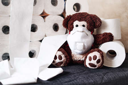 Panic, fear and world wide toilet paper crisis related to the outbreak of the COVID-19 coronavirus. A large stack of white paper rolls, on the top a teddy bear with a respirator mask, dark background.