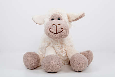 Knitted rabbit toy on a white background. Crocheted toy. Copy space
