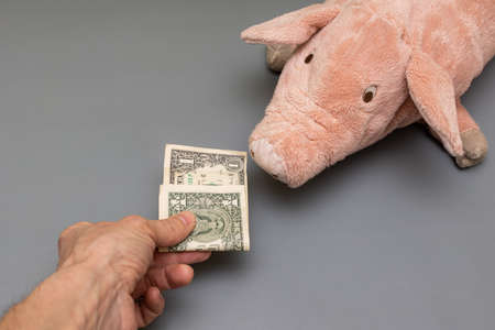 a hand holds out one dollar offering it to a toy pig. high quality photo