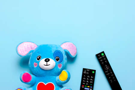 Black TV audio remote control and baby toys rattles, toy puppy on blue background flat lay top view copy space. Concept of viewing childrens television shows, cartoons, childrens films. Home leisure.