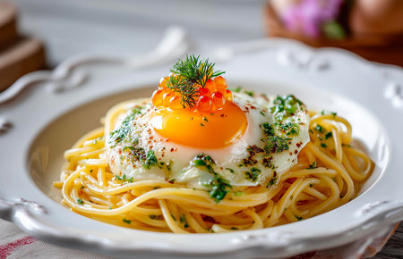 Spaghetti Carbonara with egg yolk and parsley on white plate