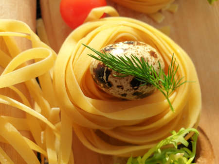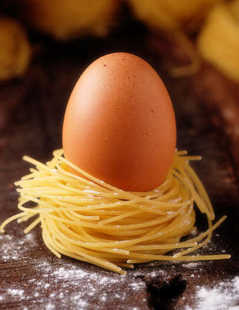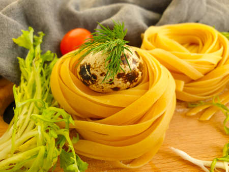 Handmade italian pasta - tagliatelle with fresh eggs on grey floury background