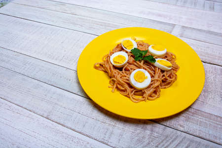 Spaghetti with eggs tomatoes sauce, mint on wooden background table