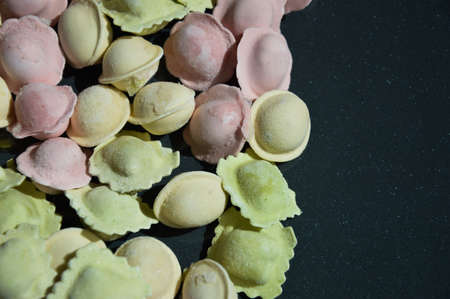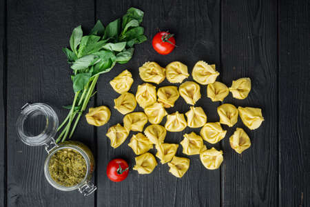 Raw Tortellini with basil and pine pesto, on black wooden table background, top view flat lay