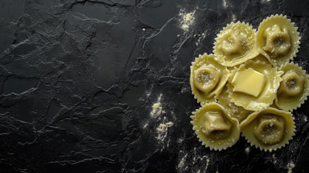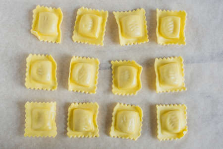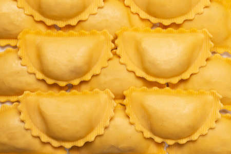 Creative layout made of ncooked ravioli pasta on cutting rustic board. Horizonta orientation with copy space. Food concept.