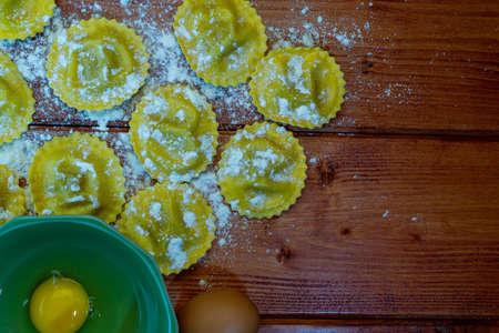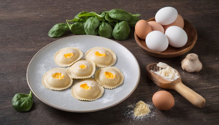 Fresh ravioli pasta stuffed with spinach, with ingredients on a wooden table. Homemade Italian food