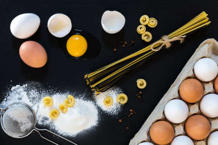 Traditional and black uncooked Italian pasta Linguine, Italian pasta Cappelletti with white and brown chicken eggs, broken white egg, flour, metal sieve and spices on black stone background.
