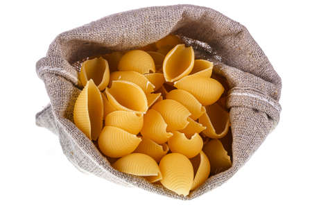 Conchiglie rigate pasta or seashell macaroni in sack isolated on white background. Italian cuisine, healthy food with carbohydrates, diet, nutrition concept.