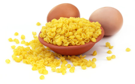 dry uncooked italian pasta lumaconi on a white background wiht copy space