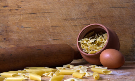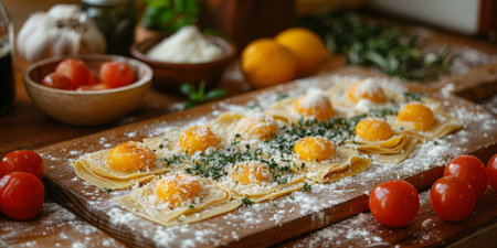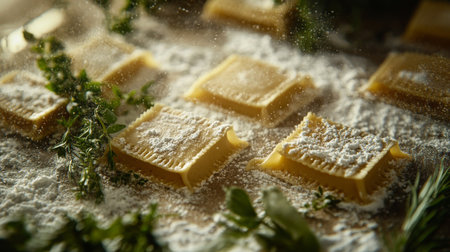 Homemade pasta dish prepared with fresh herbs and flour ready for cooking
