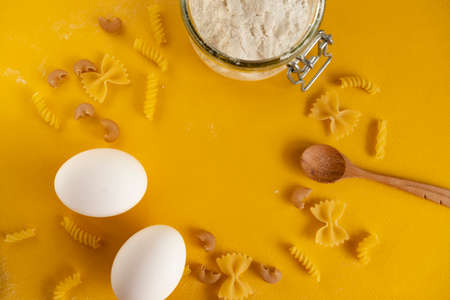 Assorted Italian pasta. On a yellow background. View from above. Pasta on a plate. Flour, eggs and pasta made from them