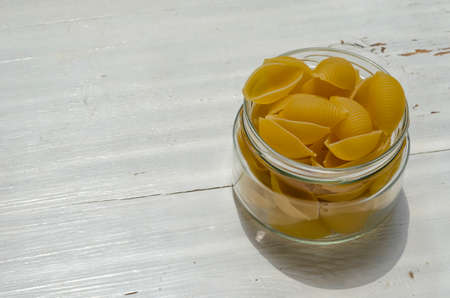 Raw Conchiglie Pasta in glass jar on white wooden background. Close-up of serving of uncooked pasta. Eco-friendly packaging for storing food. Side view at an angle. Selective focus.