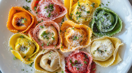 A stunning display of colorful pasta varieties beautifully arranged on a white plate, garnished with cheese and herbs, perfect for food lovers and culinary presentations.