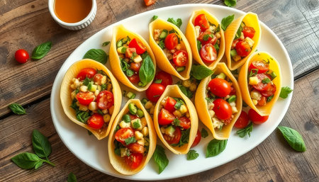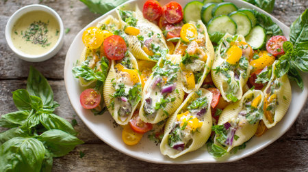 Savor these jumbo pasta shells, generously stuffed with creamy ricotta filling and vegetables like bell peppers and red onion, all garnished with fresh herbs and colorful cherry tomatoes. Served alongside crisp cucumber slices and a tangy dressing