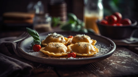Close up of Italian ravioli on wooden table. Selective focus. Toned.