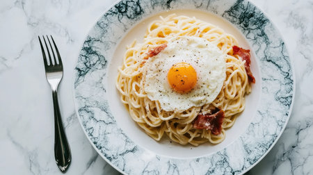 A plate of creamy pasta topped with a sunny-side-up egg and crispy bacon, set against a marble background, perfect for any meal occasion.