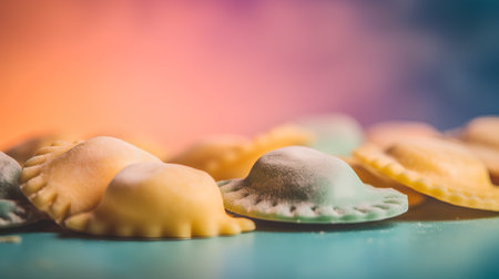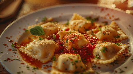 Spicy meat filled ravioli, a sweet tomato sauce drizzle, captured in the golden hour for a rustic feel