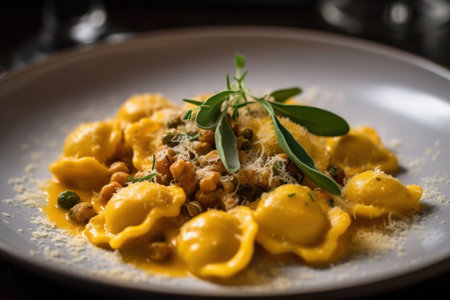 A beautifully plated dish featuring delicious ravioli smothered in a rich butter sauce, garnished with fresh herbs, ideal for gourmet dining experiences.