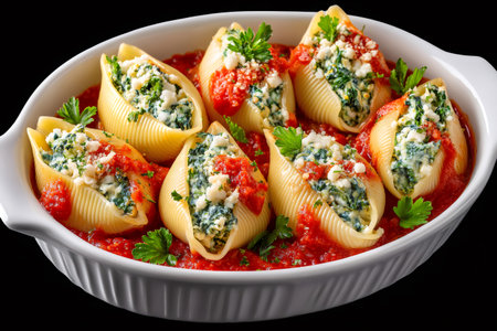 Stuffed pasta shells with ricotta and spinach filling sitting in a white baking dish
