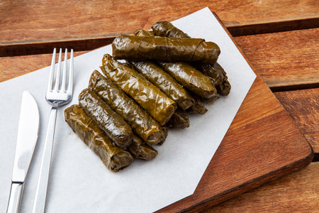 Dolma - stuffed grape leaves on a wooden board with knife and fork