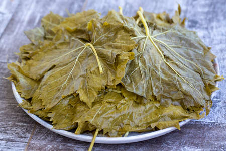 Pickled grape leaves close-up. Grape leaves for preparation of traditional oriental dishes and snacks on counter of oriental bazaar (Pickled Leaf)