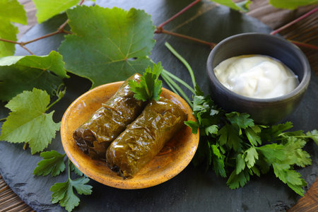 Traditional georgian dolma with sour cream and herbs on a plate, parsley, cilantro. High quality photo