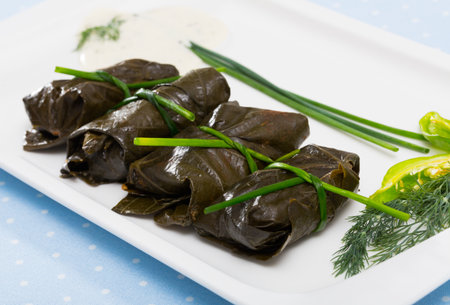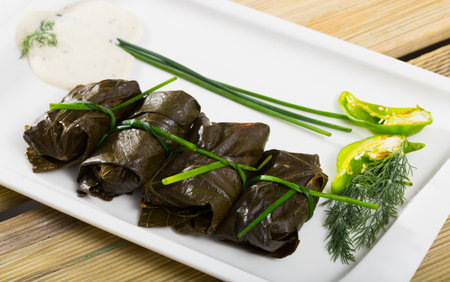 Delicious stuffed grape leaves rice, white yogurt sauce. Lebanese stuffed wrap on plate. Lebanon turkish greek middle eastern cuisine. (Turkish name; Leaf wrapping)
