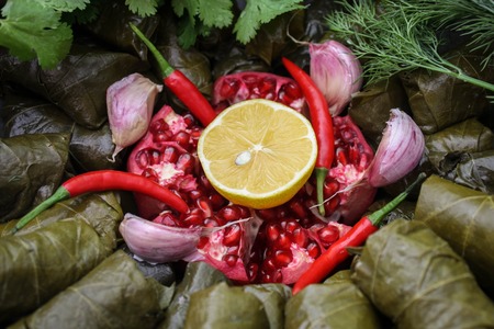 Traditional dolma served with leek, lemon and pomegranate