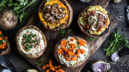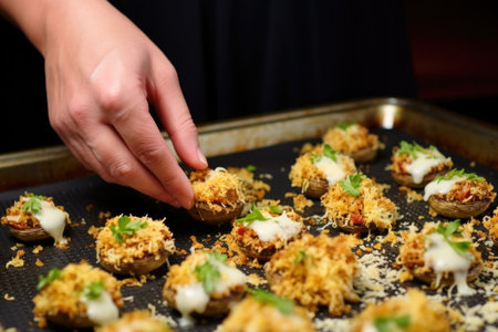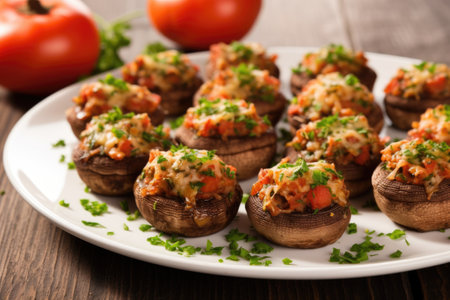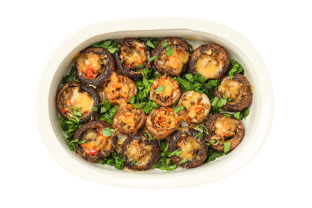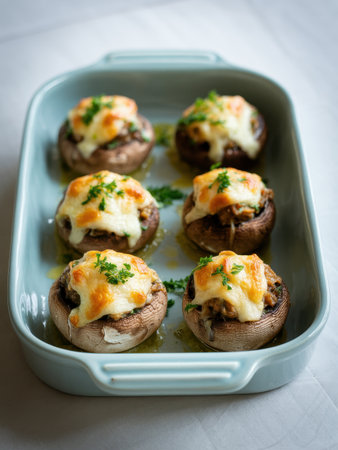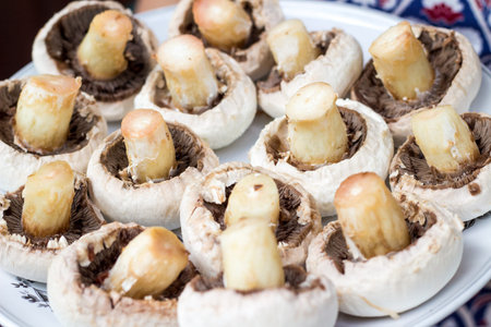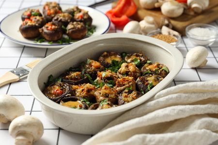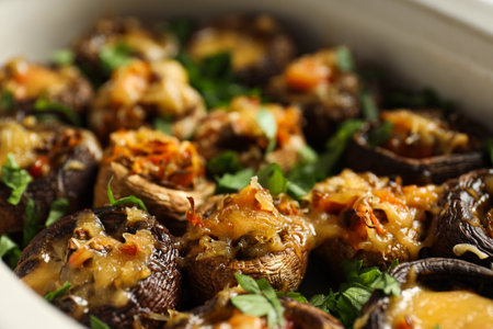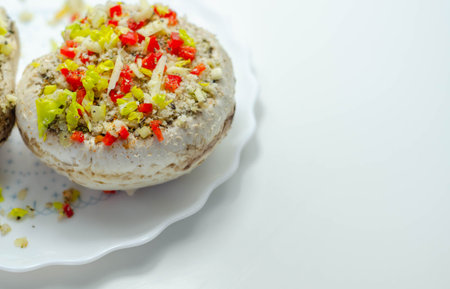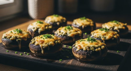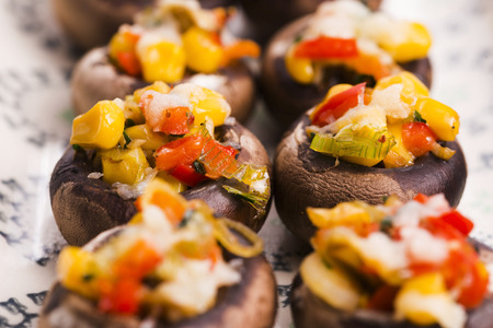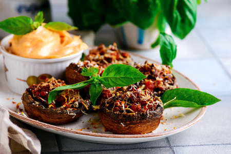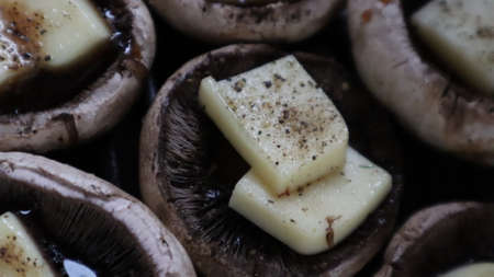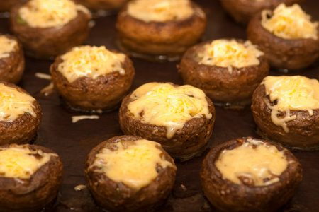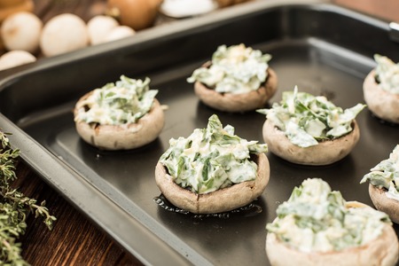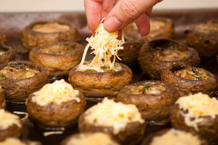 Mushrooms stuffed with onion, garlic, leek, paprika and sprinkled with cheese and breadcrumbs, snack prepared for baking, homemade