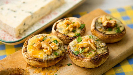 Baked muhrooms with blue cheese, red pepper and spring onion, bio product home
