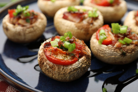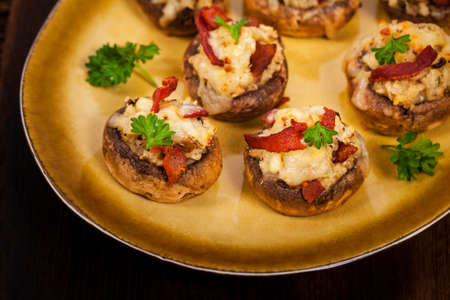 Stuffed Mushrooms with Breadcrumbs, Cheese and Bacon. Selective focus.