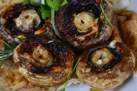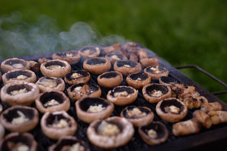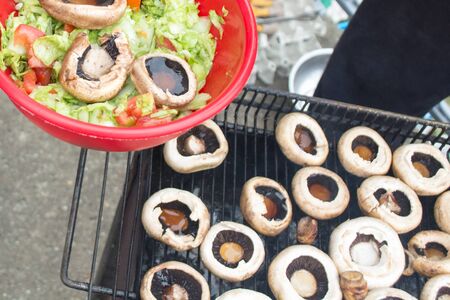 Grilled mushrooms with cheese, tomatoes and eggplant on the hot flaming charcoal grill. Champignon white mushrooms, onions and tomatoes grilled on grill with hot coal