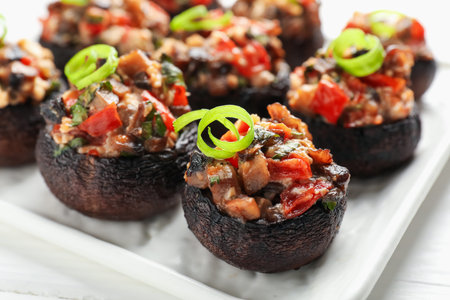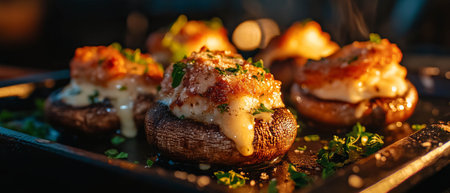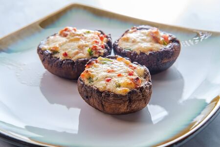Homemade Garlic Parmesan-Stuffed Mushrooms on a plate, low angle view. Close-up.