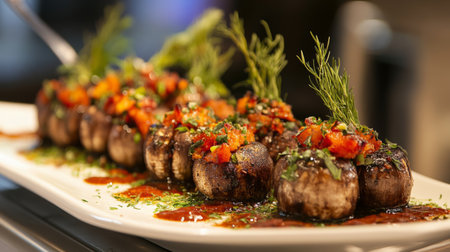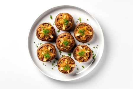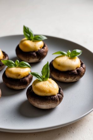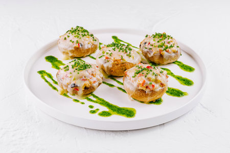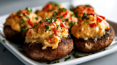 Elegant stuffed mushrooms with creamy filling served on a clean white plate, garnished with fresh herbs