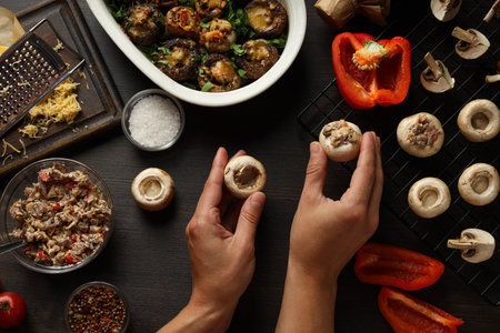 Stuffed mushrooms, kitchen board, ingredients and hands on wooden background, top view
