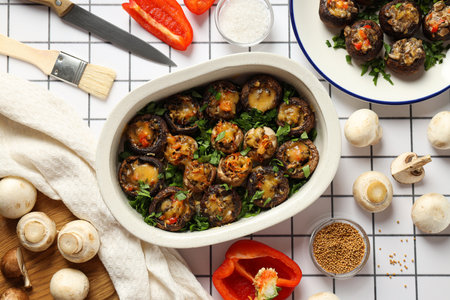 Stuffed mushrooms, towel, vegetables and spices on light background, top view