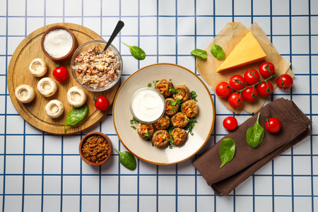 Stuffed mushrooms on plate, sauce and ingredients on light background, top view