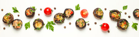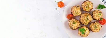 Baked mushrooms stuffed with chicken minced meat, cheese and herbs on light plate. Top view, banner, copy space