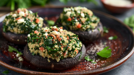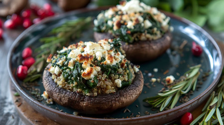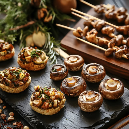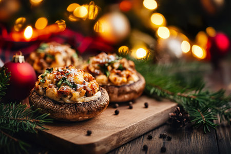 Mushrooms stuffed with rice and vegetables. Food on a table with Christmas decorations.
