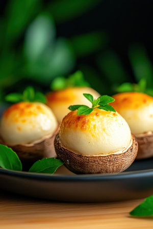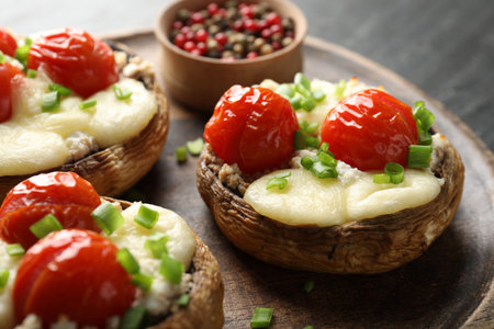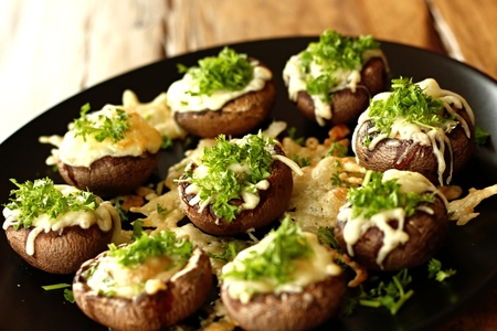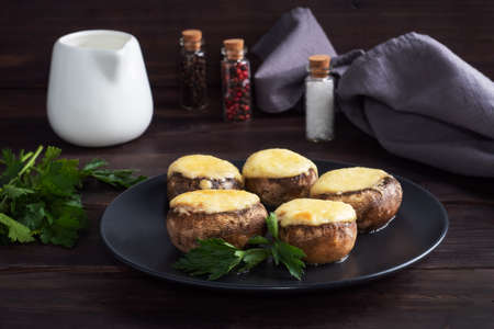 Baked mushrooms stuffed with cheese and herbs on a black plate. wooden background
