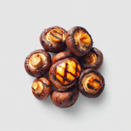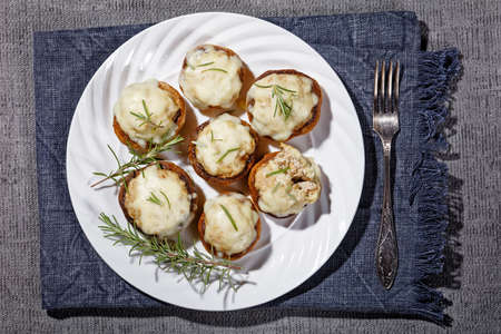 Homemade Garlic Parmesan-Stuffed Mushrooms on a plate, top view. Flat lay, overhead, from above.