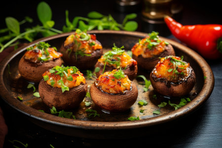 Mushroom champignons stuffed with filling of chicken, cheese, delicious appetizer