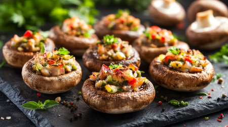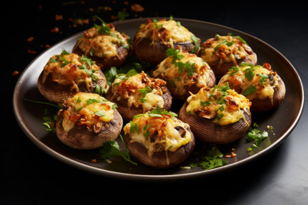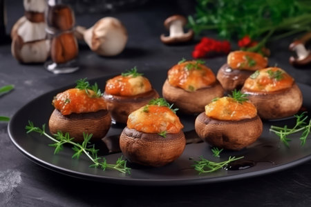 Baked stuffed mushroom caps ready for eating. Champignons, spices, vegetables, cheese. Served portion, trendy hard light, dark shadow. Black stone concrete background, copy space