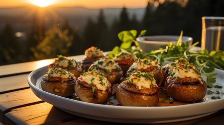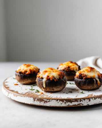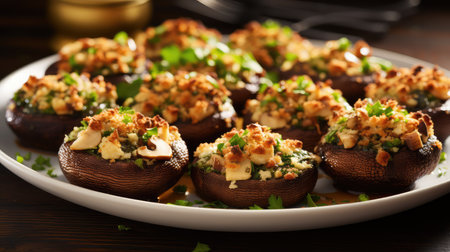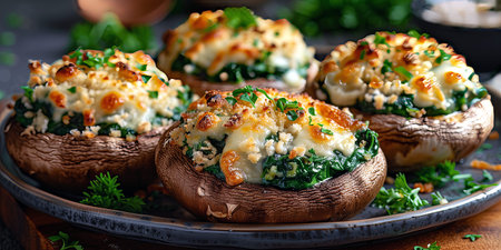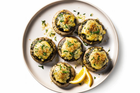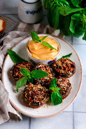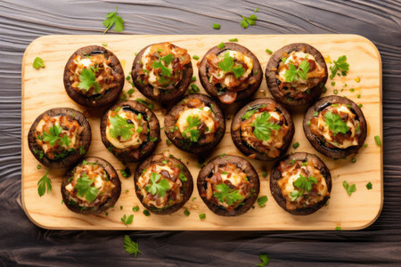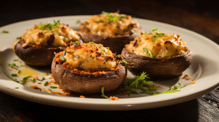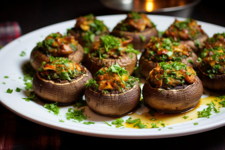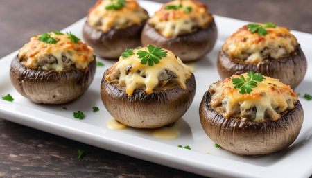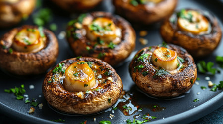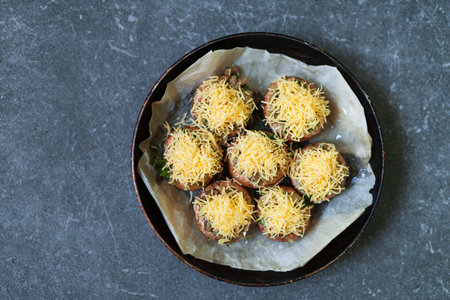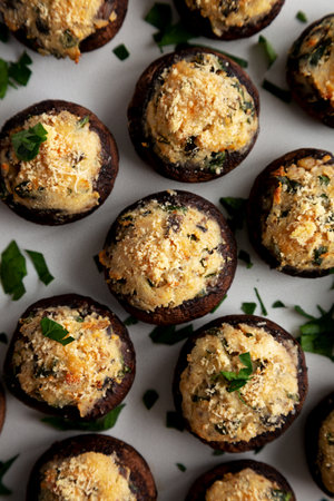Homemade Garlic Parmesan-Stuffed Mushrooms on a plate, top view. Close-up.