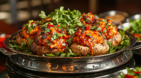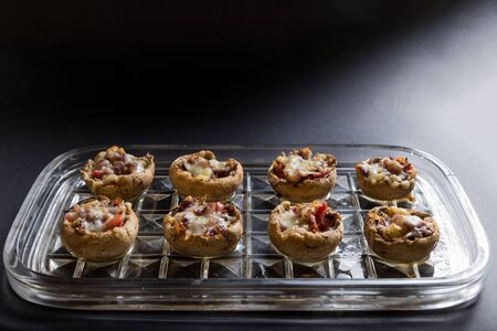Glass tray with vegetable and cheese filled mushrooms on a dark background