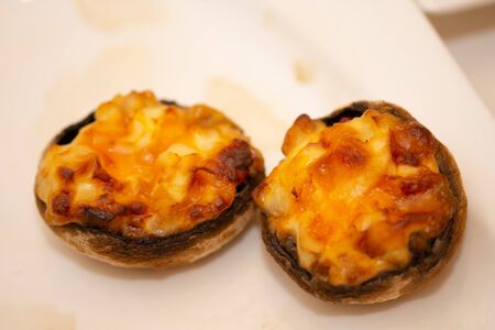 Stuffed champignons baked with cheese. Julienne. Serving food in a restaurant
