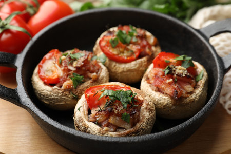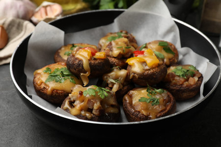 Tasty stuffed mushrooms in frying pan on black table, closeup