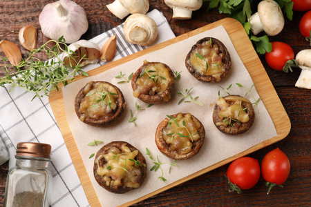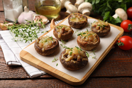 Delicious stuffed mushrooms with melted cheese and thyme on wooden table, closeup
