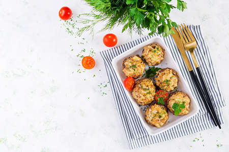 Baked mushrooms stuffed with chicken minced meat, cheese and herbs on light plate. Top view, above, copy space